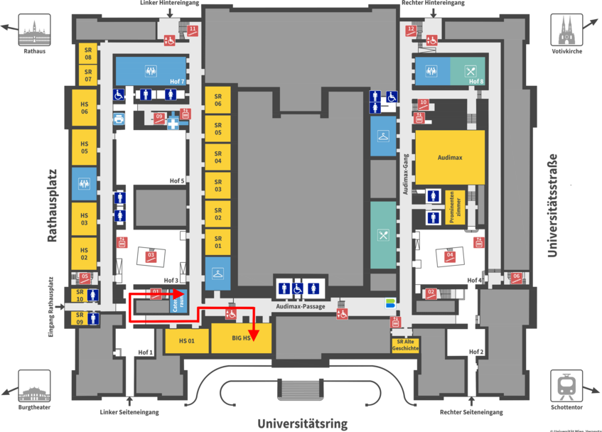 The university is conveniently accessible by public transport. Take the U2 subway line or one of several trams (2, 37, 38, 40, 41, 42, 43, 44) to "Schottentor" and use the exit "Universität". The main entrance is just a short walk from the stop. The side events will take place in various locations in Vienna.